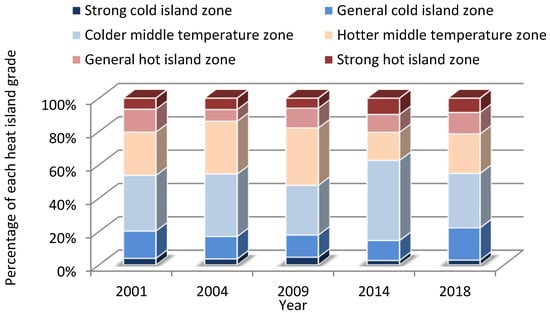 Figure 9 shows the proportional area of heat island effect in the whole study area. The proportional area of the strong cold island zone trended downward, from 3.92% in 2001 to 2.86% in 2018. The proportional area of the general cold island zone also gradually decreased, from 16.38% in 2001 to 11.98% in 2014, though it rose to 19.35% in 2018. As for the proportional area of the strong heat island zone, it first increased from 6.63% in 2001 to 9.77% in 2014, and then it decreased slightly to 8.59% in 2018. The other proportional areas, of the colder middle temperature zone, the hotter middle temperature zone and the general heat island zone, did not show a consistent trend. In 2009, the dominant heat island grade was the hottest middle temperature zone. In conclusion, the entire study area had an enhanced heat island effect, with the area of the strong heat island zone increasing and the area of the strong cold heat island zone decreasing from 2001 to 2018, both exerting great influence on the local environment.
