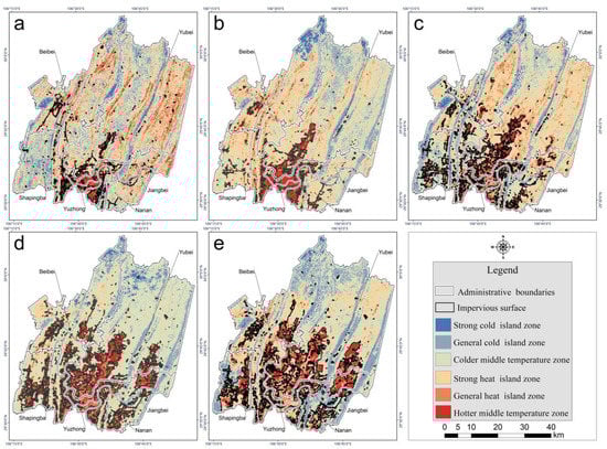 Classification of heat island strength in 2001 (a), 2004 (b), 2009 (c), 2014 (d), and 2018 (e).