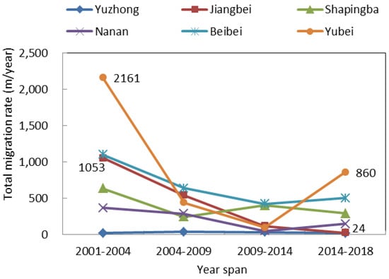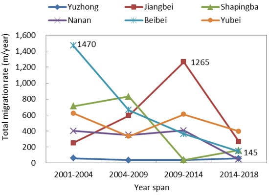 We further analyzed the impervious surface center migration using the five-stage impervious surface data, as well as the heat island strength classification data. In terms of the impervious surface center migration rate, the total migration rate in Beibei District showed a continuous downward trend, from 1470 m/year in 2001–2004 to 145 m/year in 2014–2018. The total migration rate in Jiangbei District increased sharply from 2001 to 2014 and dropped sharply to 267 m/year from 2014 to 2018. The overall migration rate in Yuzhong District was very slow, never higher than 60 m/year. In the remaining districts, the overall migration rate varied irregularly (Figure 11). The difference in migration rates among these six districts was mainly attributed to urban planning. For example, construction has saturated the Yuzhong District, and local government has been focusing on expanding the Jiangbei District since 2010, so the migration rate was very slow in the Yuzhong District but extremely fast in the Jiangbei District. As shown in Figure 12, the overall migration rate showed a continuous downward trend in Jiangbei District, from 1053 m/year in 2001–2004 and 24 m/year in 2014–2018. The overall heat island center migration rate fluctuated the most in the Yubei District, where the highest rate occurred from 2001–2004 (2161 m/year) and the lowest from 2009–2014 (97 m/year). The lowest overall heat island center migration rate appeared in Yuzhong District, never higher than 38 m/year.