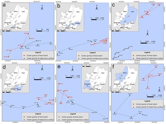 Impervious surface and heat island center migration in Yuzhong (a), Jiangbei (b), Yubei (c), Nanan (d), Shapingba (e), and Beibei Districts (f).