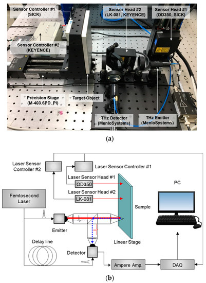 Terahertz (THz) displacement and thickness sensor: (a) experimental test setup; (b) schematic diagram.