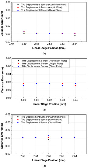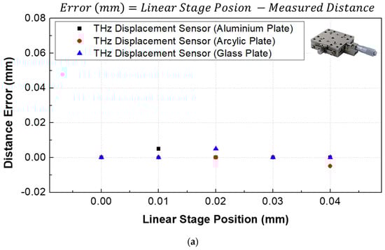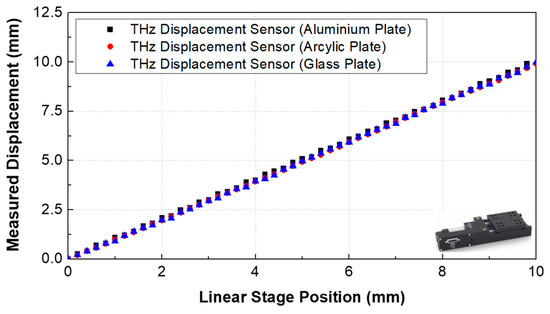 The performance of the proposed THz displacement sensor was compared with an OD350 laser displacement sensor (range: 250 mm; resolution: 200 μm; SICK Corp., Waldkirch, Germany) for long-range measurement and with an LK-081 laser displacement sensor (range: mm; resolution: 3 ; KEYENCE Corp., Osaka, Japan) for high accuracy measurement resolution with short measurement range. An aluminum plate was placed vertically on the motorized linear stage, and each THz displacement sensor was placed on the optical table, as shown in Figure 1a, to measure the displacement exerted on the sample. The displacement inputs were implemented within the range of 0–10 mm. The sample displacement was controlled using the motorized linear stage in 50 μm increments over a range of 10 mm. Next, the impact of sample transparency on sensor performance was evaluated by changing the sample material from an aluminum to a glass and acrylic plate.