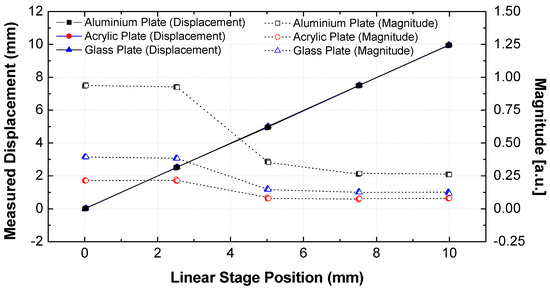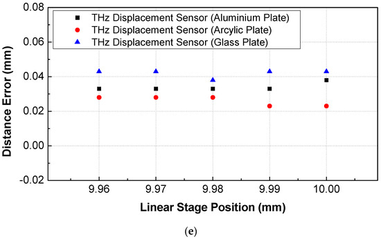 The displacement of a manual-stage-mounted sample was controlled from 0 to 10 mm in 2.5 mm increments (0, 2.5, 5.0, 7.5, and 10.0 mm) to evaluate the measurement accuracy. At each position, the precision resolution of the THz displacement sensor was considered by increasing the displacement in 10 μm increments using a manual stage (5 μm resolution). The detailed conditions and comparison results are summarized in Table 1. Figure 5 shows the measured displacement and magnitude according to the displacement of the manual stage. The measured displacement linearly increased corresponding to the distance of the manual stage. The magnitude of the maximum peak was constant up to 2.5 mm and then decreased to 5 mm. The measurement error was calculated, and the results are illustrated in Figure 6. The distance error was less than 10 μm based on the measured value—regardless of the sample material—for the entire measurement range, but the error of the measured displacement increased from 5 to 10 mm, as shown in Figure 6c–e.