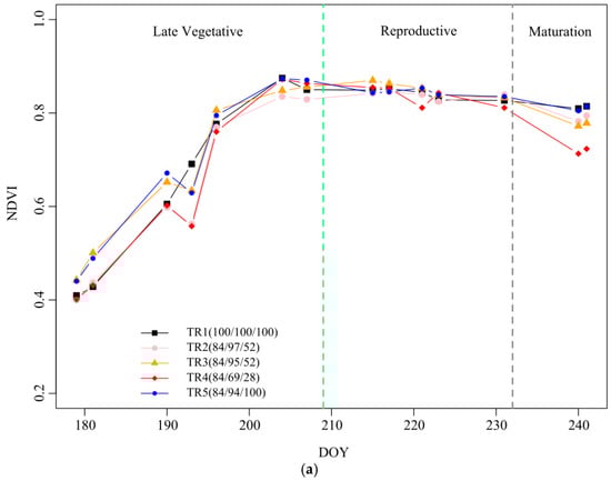 There were five different levels of deficit irrigation treatments for which we divided the study field into treatment (TR) regions (Figure 1b). In order to effectively collect data and control irrigation water, a 12 × 12 m2 experimental plot was chosen in each treatment region. The five treatments were full irrigation (TR1), slight water stress (TR5), moderate water stress (TR2 and TR3), and severe water stress (TR4). TR1 represented the total crop water requirement of fully watered maize during the whole growth period. The different levels of deficit irrigation were designed according to the percentages of applied water depth of TR1 during the late vegetation, reproductive, and maturation stages. For example, during the maturation stage, 52% of the applied water depth at TR1 was applied to TR2 (Table 1).