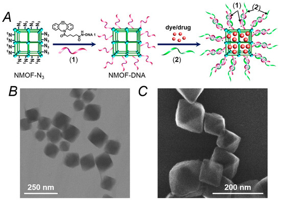 Metal–organic framework nanoparticles (NMOFs) represent a broad class of porous nanostructures [1,2,3,4]. The NMOFs are formed by the crystallization of metal ions in the presence of appropriate stoichiometry of organic ligands. Different applications of the porous NMOFs were suggested, including their use for gas separation [5] and purification [6], frameworks for catalytic transformations [7,8,9,10], sensors [11,12], drug carriers [13,14,15,16], and functional materials for fuel cells [17,18].