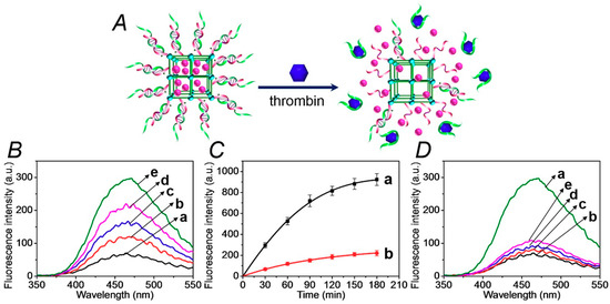 (A) Schematic unlocking of the (1)/(2)-gated NMOFs and the release of Apixaban, in the presence of thrombin, via the separation of the duplex gates by the formation of aptamer-thrombin complexes. (B) Fluorescence spectra of the released Apixaban from the drug-loaded NMOFs upon treatment with variable concentrations of thrombin for a fixed time interval of 30 minutes: (a) 0 μM, (b) 0.25 μM, (c) 0.5 μM, (d) 0.75 μM, and (e) 1.0 μM. (C) Time-dependent fluorescence changes upon the release of Apixaban from the (1)/(2)-gated drug-loaded NMOFs in the presence of (a) thrombin, 1 μM, or (b) no thrombin added. (D) Fluorescence spectra of Apixaban released from the (1)/(2)-gated, drug-loaded, NMOF upon treatment for a fixed time interval corresponding to 30 minutes with (a) thrombin, 1 μM; (b) no thrombin added; (c) BSA, 1 μM; (d) hemoglobin, 1 μM; and (e) vascular endothelial growth factor (VEGF), 1 μM.