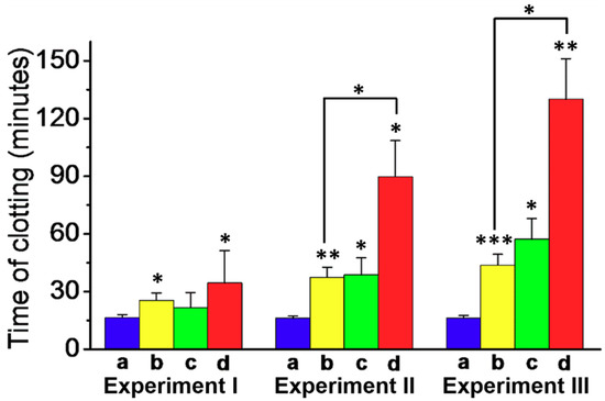 Apixaban-induced inhibition of clot formation on normal platelet-poor plasma using the Apixaban-loaded (1)/(2)-gated NMOFs loaded with different Apixaban concentrations and control systems: (a) Blue, the unloaded (1)/(2)-gated NMOFs. (b) Yellow, the pure Apixaban drug. (c) Green, the unloaded NMOFs and free Apixaban. (d) Red, the Apixaban-loaded (1)/(2)-gated NMOFs. Experiment I, Concentration of loaded/free Apixaban, 1.08 nM. Experiment II, Concentration of loaded/free Apixaban, 3.2 nM. Experiment III, Concentration of Apixaban, 5.4 nM. Clot formation was stimulated using 15 μM of CaCl2, incubated at room temperature under continuous shaking. Results derived from three different experiments. * p < 0.05, ** p < 0.001, and *** p < 0.001.