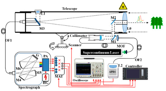 The supercontinuum laser (NKT Photonics, average output power of 100 mW, pulse repetition rate of 24 kHz, 2 ns pulse width, and broadband spectrum white light of ~450–2400 nm) produces a collimated laser beam with ~3 mrad divergence angle and ~4 mm beam diameter at output. A small portion of the emitted light beam passes through a semi-transmitting reflecting mirror M1, which transmits part of the beam through an optical fiber (OF2) to the avalanche photon diode (APD1) sensor. The APD1 sensor is used to collect a sample of the emitted pulse waveform, which triggers a measurement for capturing the emitted and echo waveforms. An achromatic refractor telescope (with a 400 mm focal length, and 80 mm aperture diameter) collected the scattered laser beam from the target. The backscattered beam is focused with the achromatic lens onto the grating spectrograph (with full width at half maximum about 10 nm for each channel and a spectral sampling interval of 17 nm), and divided into multiple channels for photoelectric detection. A linear array multianode photomultiplier (PMT) assembly is used to convert the spectrally separated light to analog voltages. The output signals from the PMT module are sampled and recorded using a high-speed oscilloscope (Tektronix DPO5024B, with 2 GHz bandwidth, 5 GS/s sampling rate for four analog channels). An average of 16 pulses is saved to improve the signal to noise ratio and to reduce the amount of data.