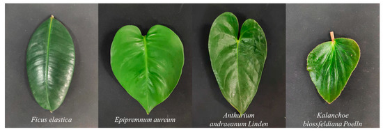 To estimate the pulse-echo arrival time difference for various material properties (spectral backscattering characteristics), four leaf samples were randomly collected from four broadleaf plant species and measured at different distances. Just shown in Figure 3, leaf species include Ficus elastica (denoted as plant leaf 1), Epipremnum aureum (plant leaf 2), Anthurium andraeanum Linden (plant leaf 3) and Kalanchoe blossfeldiana Poelln (plant leaf 4), and corresponding spectral reflectance collected by FWHSL were shown in Figure 4.