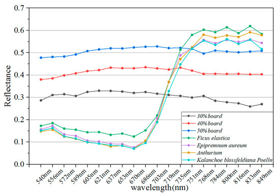 - For four plant leaves, the range deviations of the visible wavelength channels exhibited small fluctuation over varying distances compared with those of the reference board targets.