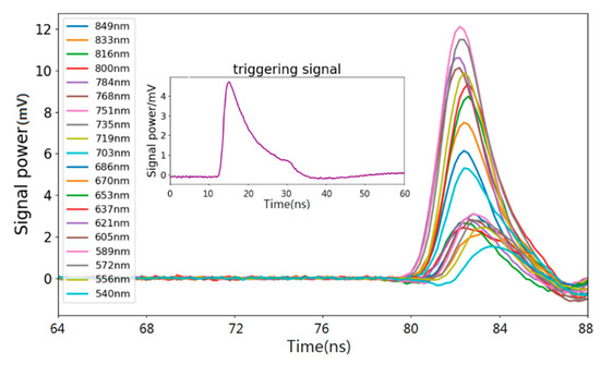 During data acquisition, a trigger condition must be set before the data acquisition card can collect pulse signals and transmit them to the system in order to avoid unnecessary acquisition and storage of pulse signals. Two types of pulse trigger are possible: the first kind of trigger is channel specific and the second kind of trigger is universal total triggers. The most important purpose of taking specific channels as triggers is to accurately record the transmitted laser power of each wavelength of the LiDAR so as to perform radiation calibration based on the radar equation and more conveniently acquire the reflectance of target in each wavelength channel. However, the latter type is used for most existing instrument setups, chiefly because the receiving echo laser power would not be diverted significantly by the trigger channel. Meanwhile, the latter type cannot avoid the non-synchronization of emission time of different wavelength in SC laser source. Usually an optical filter [25] or a grating (see Figure 1) is installed before an APD or PMT and utilized as a spectroscopic device to select the wavelength of the backscattered echoes. Some spectroscopic devices can consist of an acousto-optic tunable filter or a liquid crystal tunable filter. AOTF and LCTF can cause more attenuation of the laser beam and more loss of outgoing laser power compared with optical filter and grating. However, AOTF and LCTF are the technique of time division multiple spectral filters, which alleviate the pulse delay effect caused by the SC laser source.