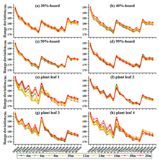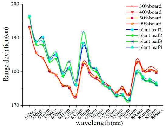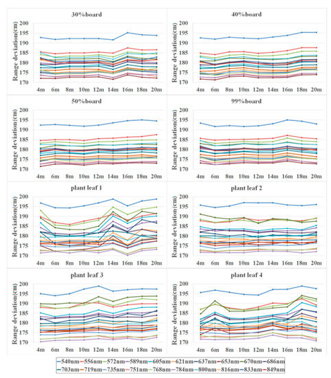 To better understand the distribution of the range deviation of the 20 spectral channels, Figure 7 presents range deviation spectra at various distances. Each target exhibited a distinct response in different spectral channels. The range deviations of each target are distributed with a ‘W’ shape that was higher for shorter wavelengths than for longer wavelengths, especially for plant leaf samples. The following results can be observed from the range deviations conveyed by Figure 7 and Figure 8: