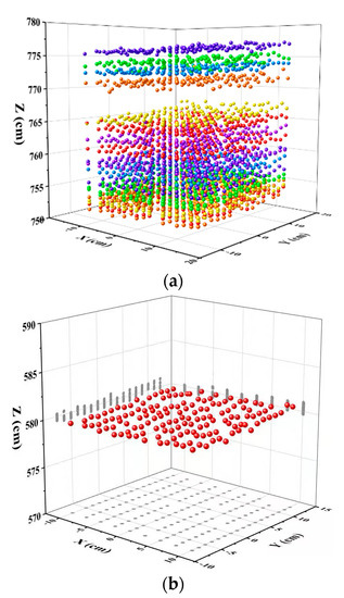 Figure 9 shows 3D point cloud visualization of a reference board. The reference board with a size of 20 cm × 20 cm was scanned by the FWHSL sensor at a position of 5.8 m from the aperture of the telescope. There is a point cloud duplicated imaging effect for the same observation object due to the different range values of 20 channels (see Figure 9a). The advantage of the practical approach for correcting the effect of pulse signal decay is shown in Figure 9b, the calibrated result shown in Figure 9b is based on a specific channel (719 nm). After a calibration of the pulse signal decay effect, the point cloud duplicated imaging effect was eliminated and accurate three-dimensional geometric information of the reference board was obtained.