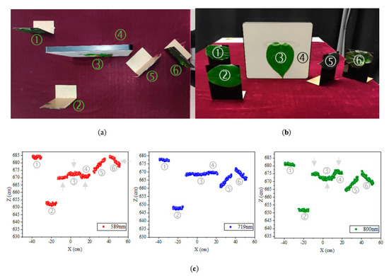The point clouds captured by the hyperspectral LiDAR are depicted as false color point clouds in Figure 10c. The 589 nm, 719 nm, and 800 nm channels of false color were assigned by red, blue and green, respectively. The results showed that the relative position of Target 4 moves forward in 589 nm channel and backward in 800 nm channel. In addition, the relative position of Targets 5 and 6 in 589 nm channel were obviously backward. For 589 nm and 800 nm channels, there were obvious deviations in the positions indicated by the gray arrow, which correspond to the deviations in the Figure 8. The advantage of unique channel was shown in 719 nm channel due to the geometric invariability in the red edge channel. Relative positions and shapes of all targets were well reconstructed by the point clouds collected by the hyperspectral LiDAR.