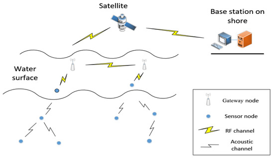 Underwater sensor networks (UWSNs) [1] deploy sensor nodes to communicate and simplify computing functions in the monitored area, as shown in Figure 1. The nodes communicate through underwater acoustics and form an Ad Hoc Network. The data are collected by carrying sensors, such as conductivity sensors, temperature sensors, depth sensors, and so on. It enters maritime network through intelligent data gateways or other offshore based stations. UWSNs have made many achievements in underwater environment exploration, such as marine data collection, water quality monitoring, and marine ranch prediction.