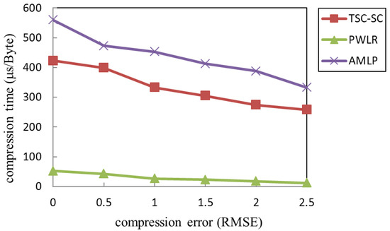 Compression algorithms applied to wireless sensor networks have put forward the basic requirements in terms of complexity and compression effect. In the article [3], compression precision and compression ratio are used as the performance indicators to evaluate the compression effect of a data compression algorithm based on data correlation applied in the wireless sensor network (WSN), including the two-step data compression algorithm based on sequence correlation (TSC-SC) [4], adaptive multiple-modality data compression algorithm based on lifting wavelet and adaptive polynomial fitting (AMLP) [5], and data compression algorithm based on piece-wise linear regression (PWLR) [6]. The computational complexity of these algorithms be satisfied by the UWSNs node hardware configuration can satisfy the computational complexity of these algorithms. These algorithms are all based on a time-domain compression algorithm, and the compressed data is sent after the accumulation of local compressed data. The compression accuracy is adjustable. These features ensure algorithm is suitable for the most sensor network applications, including UWSNs. As shown in the simulation results [3], under the same compression accuracy requirements, the AMLP algorithm produces a lower compression ratio, followed by TSC-SC, while the PWLR algorithm produces the highest compression ratio. To further analyze the time complexity of each algorithm, we used ATMEL AVR Studio 4 [7] to compile the algorithms to get the time cost of each algorithm, as shown in Figure 2.