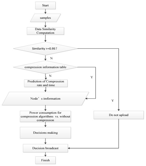 As seen in Figure 3, the information that is required by the gateway to perform the data uploading decisions including: the similarity between the current data to be uploaded and the previous data; the compression ratio obtained by the alternative compression algorithm; and the transmission power, reception power, calculation power, data transmission rate, data retransmission rate, and source node location of the related nodes. This information is mainly provided by the three modules of sensor nodes. The node transmission power and its data transmission rate are obtained by performing the joint power control and rate adjustment algorithm that was described in Section 3.2. The algorithm can select the appropriate transmission power and data transmission rate according to the existence of animals and the channel conditions. The data retransmission rate is obtained by calculating the average retransmission rate of the data that were uploaded in the previous i-th rounds. The data similarity is obtained by calculating the similarity between the data to be uploaded in this round and the data from the previous round using the gateway processing unit, which was set as the precision requirement of each alternative compression algorithm, and the corresponding compression ratio and compression time are calculated. The receiving power and computing power are determined by the node’s hardware. Based on the above information, the gateway makes the UWSNs data upload decisions with the goal of maximizing the energy savings of the integrated network. If the decision-making results no need to be uploaded, the decision-making process is completed; if the decision-making results need to be uploaded, the total energy consumption of the uploaded compressed data, including the node compression calculation’s energy consumption and the total energy consumption of directly uploading the raw data, need to be compared. The sensor node executes an alternative compression algorithm according to the accuracy requirement or uploads the raw data directly without compression. Finally, the decision results are fed back to the source nodes.
