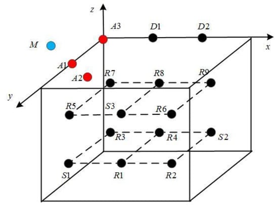 In this section, we verify the energy optimization function of the proposed data upload decision-making mechanism for a UWSNs. The network topology is shown in Figure 5, where A1–A3 are the three anchor nodes for locating sensor nodes and animals. Among them, A1 and A3 are deployed on the water surface, A2 is set to 250 m below the water surface. D1and D2 are the gateway nodes (sink nodes), deployed on the water surface, that receive the data from the sensor nodes and are responsible for receiving and collecting data. Suppose nodes S1–S3 are the source nodes of the data transmission and R1–R9 are the relay nodes, among which S1, S2, R1, R2, R3, and R4 are set to 1500 m below the water surface; and S3, R5, R6, R7, R8, and R9 are set to 500 m below the water surface. They are deployed in the range of 2000 × 3000 × 2000 m, and the range is divided into 12 1000 × 1000 × 1000 m grids. Each sensor node is placed in the center of a 1000 × 1000 × 1000 m three-dimensional cube space; the communication range is set to 1000 m. We use M to represent an animal that is detected traveling at a speed of V (1,0,0). We selected 10 groups of data in chronological order from the measured data of the temperature, salinity, and dissolved oxygen in one week near an island located in Sanya, Hainan province, China. Each group contained 50 sample data, the packet length was 100 B, and all data were normalized to [0, 1].