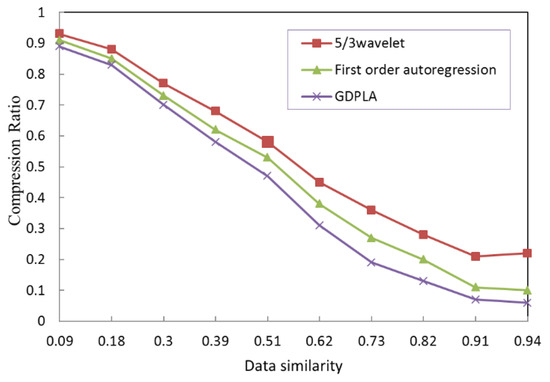 To intuitively evaluate the compression performance of each alternative compression algorithm, Figure 6 depicts the CR with varying data similarities. This figure shows that the accuracy requirement that is represented by the data can similarity lowers the CR. When monitoring the data of a single node, there is such a relationship: the higher the data similarity, the lower the CR, and the better the compression performance. As shown in Figure 6, the GDPLA and first-order autoregressive prediction that the higher algorithmic complexities can produce better compression performance.