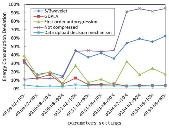 In Figure 7, the parameter setting on x-axis d0.09-h2-r90% shows that the data similarity (d) is 0.09, the number of hops away from the gateway (h) is 2, and the data retransmission ratio (r) is 90%.