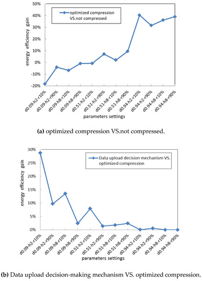 We compared the network energy efficiency gain when using the unified optimized compression algorithm with better compression performance, against when the data are not compressed or our proposed data upload decision-making mechanism is used. The simulation results are shown in Figure 8.