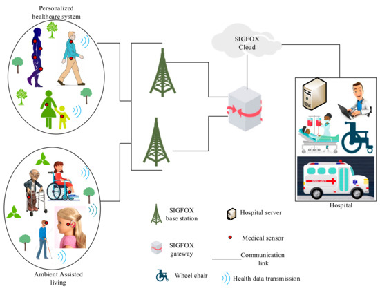 Sigfox is another wireless communication network in the category of the LPWAN proprietary technology that aims to meet the IoT requirements in wireless systems, including WBANs. Sigfox was designed to achieve a long-range communication, easy connectivity, prolonged battery lifetime, better network capacity, and reduced device (i.e., Sigfox module) cost. It offers high QoS requirements which have better resistance to interference issues. Sigfox technology is suitable for low-cost devices that are expected to operate on low power and also need to transmit data across a large communication range. Furthermore, Sigfox utilizes the sub-1 GHz ISM unlicensed frequency band of 915 and 868 MHz in Europe and in the US, respectively, at an extremely low data rate of about 100 bps; thus, Sigfox can achieve high sensitivity over long-range communication by employing a line-of-sight communication method. For instance, Sigfox can attain a communication coverage of around 50 km in rural regions, which can be extended with the help of frequency hopping, while the range reduces to about 10 km in urban regions because of obstructions [33]. With all the mentioned characteristics of this technology, Sigfox can be regarded as an excellent wireless technology that can be used in WBAN medical applications, such as remote HCM to attain low power consumption, long-distance communication, good security mechanisms, and low electromagnetic radiation on patients’ bodies [34] However, Sigfox has a few constraints, including low data-transmission rate, interference issue, and high latency. Also, note that this technology has a limited battery lifespan of about five years, depending on the WBAN application requirements. The architecture of Sigfox communication system in WBAN for health-care application is shown in Figure 2.