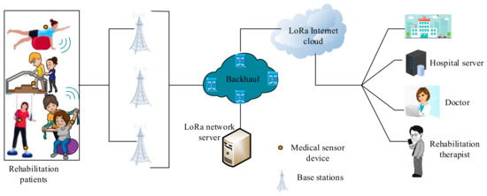 The LoRa Alliance proprietary LPWAN technology is composed of two main components, LoRa and a LoRaWAN protocol [35]. LoRa implies long range and is a patented wireless technology that could be employed in wireless systems, such as WBANs, to target low-powered devices and devices that are not required to send more data at a time. As a result, LoRa could be used to extend the battery lifespan, obtain a low-device cost, achieve a long communication range, and enhance network capacity [36]. LoRa PHY layer operates on the free licensed ISM bands of 868 or 915 MHz, depending on the deployment area. Similarly, a single LoRa BS or gateway could provide coverage in an urban region of about hundreds of kilometers (100 km), depending on the environment and the presence of obstacles. LoRa has a link budget that is higher than any other legacy communication technology standards. In addition, the low-power and the long-range communication characteristics of LoRa makes it an amazing technology for sensing and monitoring systems that includes WBAN systems in HC, as well as WSN systems for environmental monitoring, industrial applications, and smart metering [37].