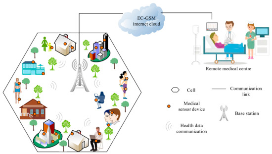 In EC-GSM technology, the 3GPP proposed an extension of the GSM coverage by adapting and leveraging the legacy 2G infrastructure in order to offer a reliable and efficient IoT connectivity in wireless networks. This technology employs two modulation schemes that include the 8-ary phase shift keying (8PSK), which provides support for a transmission rate of about 240 kbps and a Gaussian Minimum Shift Keying (GMSK) with a data rate of about 350 bps to 70 kbps. In addition, the EC-GSM communication network target about 50,000 sensor devices in a single cell and may support a link budget within the range of 154–164 dB based on the power of transmission; it also employs an eDRX modulation mechanism to enhance energy efficiency [46,47]. For clarity purposes, it is noteworthy that a cell is the geographical area that a single BS can service (or cover) in cellular networks, and a typical scenario of the EC-GSM technology in the context of WBAN domain, including health data transmission to a remote hospital, is provided in Figure 4.