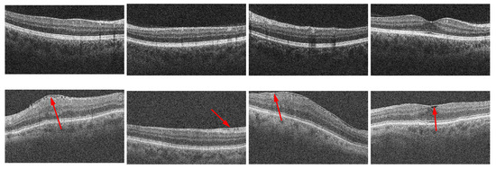 Multiple instances of 2D Optical Coherence Tomography (OCT) slices from different 3D OCT volumes with and without the presence of the Epiretinal Membrane (ERM). 1st row, OCT images without ERM’s presence. 2nd row, OCT images with ERM’s presence. The arrows point to the ERM’s presence, depicted as a hyper-reflective section on the Inner Limiting Membrane (ILM) layer.