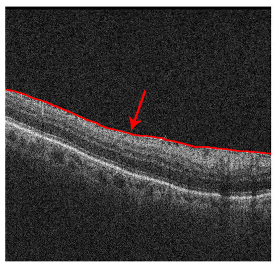 Localization of the region of interest. The arrow points to the segmented ILM layer.