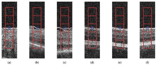 Regions of interest around the ILM layer points represented by the rectangular-shaped window and the five square-shaped windows. (a–c) Samples including ERM. (d–f) Samples without ERM.