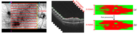 ERM classification process of a 3D OCT volume. A total of n OCT scans were generated for each patient, situated equidistantly in the complete retinal surface. The classification results for the n 2D OCT slices were arranged vertically in a reconstruction of height n, where each row represents the presence or absence of ERM in the associated 2D OCT slice. The post-processing stage improves the quality of the 2D map reconstruction by connecting neighboring pathological regions. (a) ERM classification before the post-processing map refinement stage. (b) ERM classification after the post-processing map refinement stage.