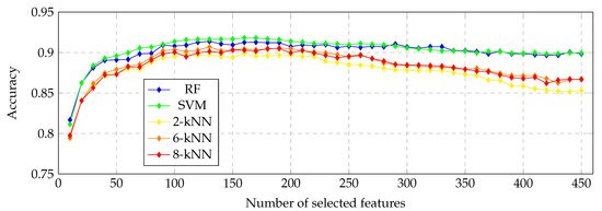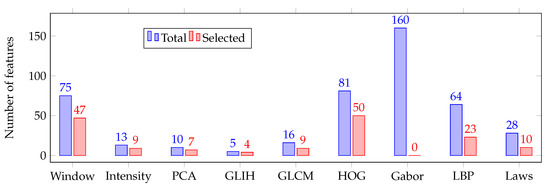 These models were trained and tested using input sets with a variable number of relevant features. In order to avoid possible overfitting during the training process, we performed a 10-fold cross-validation, obtaining the mean accuracy of each resulting model. The evolution of the model accuracy is shown in Figure 7. Table 2 also describes the accuracy results in a limited region, also highlighting the most accurate performance for each model. Afterwards, we performed a fine-grain analysis to obtain the optimal number of features for each classifier type, as Table 3 depicts. As we can see, the stability of the feature dimensionality is clear, reaching numbers in all the cases between 140 and 200 features. In such cases, the stability is also significant in terms of the performance, reaching the best accuracy with the SVM but also with similar values for the rest of the analyzed classifiers. Figure 8 illustrates a breakdown of the 159 selected features with the most accurate model, emphasizing the selection of many domain-related and HOG features that capture the difference profiles and gradients of the ERM’s presence and absence, respectively.