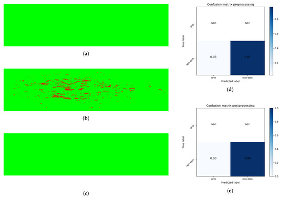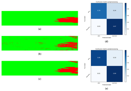 Complete result of a classification process. (a) The ground truth of the presence of ERM in the 3D OCT volume. Red pixels represent ERM instances, whereas green pixels symbolize non-ERM instances. (b) The resulting image from the automatic classification process. (c) The result after performing the post-processing stage. (d) The confusion matrix for the classification stage, resulting in Dice and Jaccard coefficients of 0.754 and 0.605. (e) Analogously, the confusion matrix after applying the defined post-processing operations, with increased Dice and Jaccard coefficients of 0.882 and 0.789, respectively.