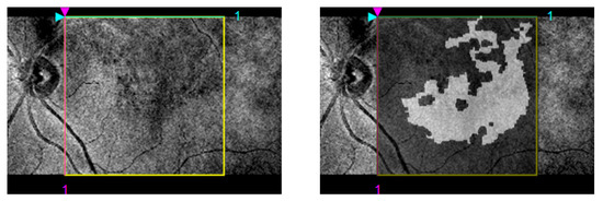 Later, the classification results obtained from the same 3D OCT volume were aggregated in a preliminary 2D reconstruction map of the ERM’s presence/absence in the retinal area. Each row of the resulting image describes the classification result of the respective OCT image in the full retinal volume, resulting in an accurate visual representation of the ERM extension over the macular region, as Figure 6 depicts.