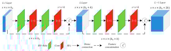 The basic unit of DenseNet is a dense block, as shown in Figure 1. We denote the feature maps of the L-1 layer as , where s represents the size of feature maps and represents the number of channels. H(·) [14] represents a nonlinear transformation, which includes a series of operations: Batch Normalization layer (BN), Rectified linear unit (Relu) activation function, a 1 × 1 convolution layer and a 3 × 3 convolution layer, as shown by the short dashed arrow. The 1 × 1 convolution operation is adopted to reduce the number of channels, aiming to improve the computational efficiency. The 3 × 3 convolution operation is used for feature reorganization. The non-linear transformation H(·) does not change the size of feature maps but only changes the number of channels to k (k = 32). The long dashed arrow represents the dense connection, which directly connects the feature maps of L-1 layer to the L layer and then make a concatenation with the output of H(·), thus resulting in . Similarly, the output of L+1 layer is .