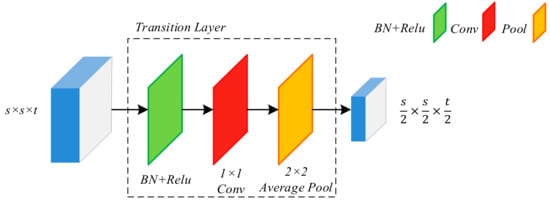 Since the number of feature maps will increase dramatically after multiple dense connections, a transition layer is designed to reduce feature dimension from previous dense block, as shown in Figure 2. The transition layer consists of BN and a 1 × 1 convolutional layer followed by a 2 × 2 average pooling layer. The 1 × 1 convolution reduces the number of channels to half of that of the previous layers while the 2 ×2 average pooling reduces the size of the feature maps.