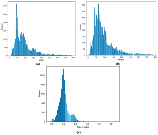 Distribution of aircraft shapes in the training set: (a) width, (b) height, and (c) aspect ratio.