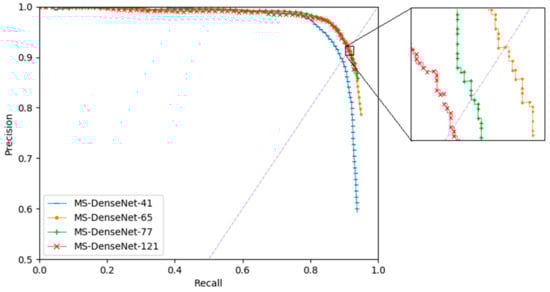 Figure 6 plots the precision-recall (P–R) curves of each model. The dotted line connects point (0,0) and point (1,1). The intersection of the dotted line and the P–R curve is equilibrium point. The location of the equilibrium point can be used to measure the performance of the model. The closer it is to point (1,1), the better the performance will be. Therefore, it is apparent that MS-DenseNet-41 performs the worst while MS-DenseNet-65 performs the best.