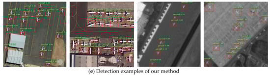 The comparative experiments of Table 6 and Table 7 reveal that our method has a great advantage in small aircrafts detection. From Figure 7, we can also see that our method is capable of detecting aircraft targets of different resolutions and shows strong feature representation ability in the detection of dense small targets. Moreover, in the test experiments of two new data sets UCAS-AOD and RSOD, our method can still obtain more than a 92% F1-score, which demonstrates a good transferability.