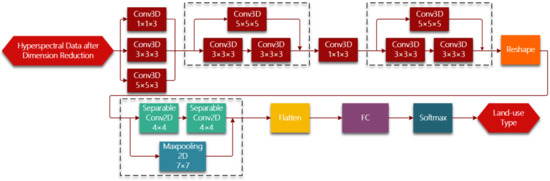 A deep CNN model called AlexNet won the championship of the ImageNet Large Scale Visual Recognition Challenge (ILCVRS) in 2012, creating a giant wave of solving image processing issues with the study of the CNN model. Since then, VGG [32], GoogleNet [33], ResNet [34], and other networks with excellent performance in the ILCVRS competition have overcome one milestone after another in CNN model research. In addition, the lightweight design of the CNN model has attracted more attention in recent years, aiming at reducing computational complexity. Xception [43], SqueezeNet [44], MobileNet [45], ShuffleNet [46], and other lightweight CNN models have been proposed successively. Researches on the CNN model strongly promote its penetration into related image processing areas. CNN-based hyperspectral classification mainly focus on hierarchical feature extraction with 2D-CNN or 3D-CNN. 2D-CNN-based hyperspectral classification mostly extract spatial features form hyperspectral data after dimension reduction [37,38]. The number of retained spectral bands and spatial window size vary from model to model. However, because of spectral information loss during 2D convolutional operation, the accuracy of 2D-CNN-based hyperspectral classification can be improved by utilizing 3D-CNN to extract spatial–spectral features. Chen et al. extract the deep spatial–spectral features from hyperspectral data using the 3D convolution kernel [39]. The spatial window size is 27 × 27 and kernel size is 5 × 5 × 32. Li et al. built a 3D-CNN-based model with relatively small kernel and window size [40]. Moreover, features with stronger discrimination can be extracted by optimizing the network structure of 3D-CNN. Hamida et al. alternatively used 3D convolution kernel of different scales to extract spatial–spectral features [41]. He et al. used multi-scale convolution kernel in the same convolutional layer to extract spatial–spectral features, and then concatenated the extracted spatial–spectral features for hyperspectral classification [42].
