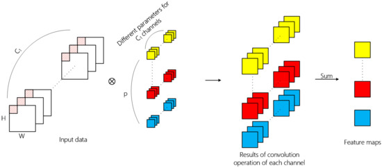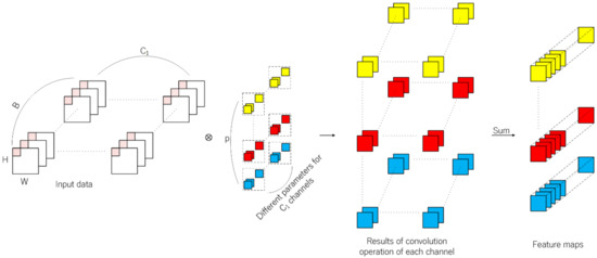 It can be observed from the operation process of traditional 2D convolution that in terms of feature map generation, the information of spatial dimension and channel dimension is mapped simultaneously. Different from traditional 2D convolution, depth-separable convolution can be divided into depthwise convolution and pointwise convolution. Firstly, every channel of input data is convoluted by 2D convolution kernels and the number of kernels is usually set to one in depthwise convolution. The second step is similar to traditional 2D convolution of which kernel size is 1 × 1. The above operation process is illustrated in Figure 4.