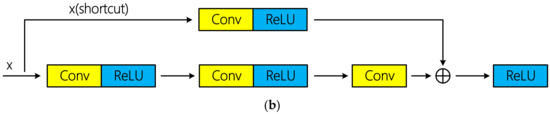 Schematic diagrams of two types of residual connections: (a) Identity connection; (b) non-identity connection using convolutional layer for dimension adjustment.