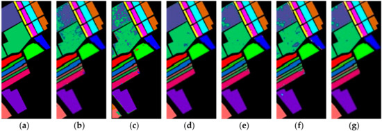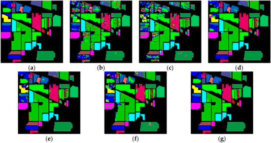 The classification maps of Salinas. (a) Ground truth. (b–g) Predicted classification maps for 2D-CNN, M3D-CNN, HybridSN, Model A, Model B, and R-HybridSN, respectively.