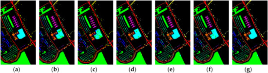 The classification maps of University of Pavia. (a) Ground truth. (b–g) Predicted classification maps for 2D-CNN, M3D-CNN, HybridSN, Model A, Model B, and R-HybridSN, respectively.