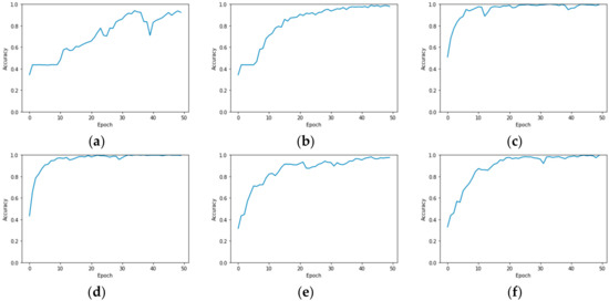 Training accuracy curves in six consecutive experiments (a) Model B_1.2%, OA = 93.37%; (b) Model B_1%, OA = 94.01%; (c) R-HybridSN_1.2%, OA = 97.52%; (d) R-HybridSN_1%, OA = 97.03%; (e) Model A_1.2%, OA = 95.95%; (f) Model A_1% OA = 96.39%.