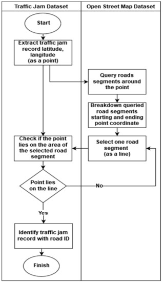 The process of integrating datasets of traffic jam dataset (Table 1) and OSM is shown in Figure 2. The first step is to extract the coordinate information (latitude and longitude), and traffic jam measure from the dataset as a data point. Secondly, on the OSM, querying out 10 (or more, by setting) road segments which are near to the data point, and connecting the starting and ending coordinates of each found road segment as a line. Third, assuming each road centered with a line has a certain width, check if the point lies on the road. If yes, the traffic measure of the point can be associated with the found road segment. If no, then keep checking if the point can be associated with the other road segment. If one point does not lie on all found road segments, it means the coordinate of the point is too far from the road and can be considered as a useless point.