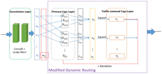 Secondly, a product of and expresses the agreement between capsules and capsule is employed to get a single primary capsule prediction to the class capsule at the traffic jam caps layer where is the coupling coefficient. The higher the agreement is the more relevant the two capsules are. Thus, increasing the agreement will also be increasing the coupling coefficient.