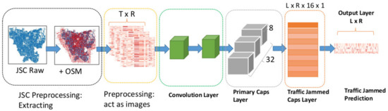 One drawback of the CNN-based model is that the max-pooling operator only takes the maximum value of the activation. This treatment ignores some of the information about spatial-temporal or the road network. Because all road segments in the urban transportation network are related, a small change at a certain road segment may affect other road traffic conditions. To address this issue, CapsNet, which uses road network images as inputs, can be applied. CapsNet enables the network to learn and capture the relationship of traffic jam information at certain times and spaces which presents the characteristics of the urban transportation, especially under UST condition.