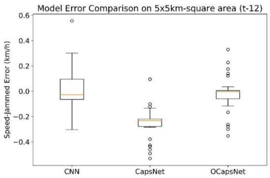 Figure 8 plots all of prediction errors (unit is kilometer/hour) generated by CNN, CapsNet, and OCapsNet. Obviously, CNN has a much wider distribution of errors (standard deviation is 0.17) although the average of error is near zero. On the contrary, the error distributions of CapsNet and OCapsNet are much compact and their standard of the errors are 0.12, and 0.14, respectively. However, the average error of the original CapsNet is lower and shifted from zero. From Figure 8, we can also conclude the proposed OCapsNet has better prediction on traffic jam speed under UST.